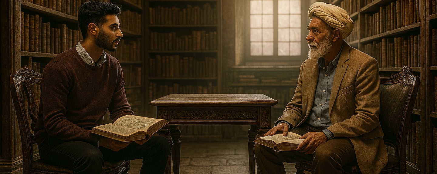 القصة تبدأ في مكتبة عتيقة، حيث يجلس الشاب ليث مثقلًا بأسئلته الداخلية، ليجد نفسه في مواجهة الأستاذ سهيل، رجل الحكمة الذي لا يمنح إجابات جاهزة بل يفتح أبوابًا جديدة للأسئلة. الحوار بينهما يكشف عن صراع الإنسان مع مفاهيمه الموروثة، مع القيم الدينية والاجتماعية التي شكّلت وعيه منذ الطفولة، ومع رغبته في التحرر دون أن يفقد جذوره.